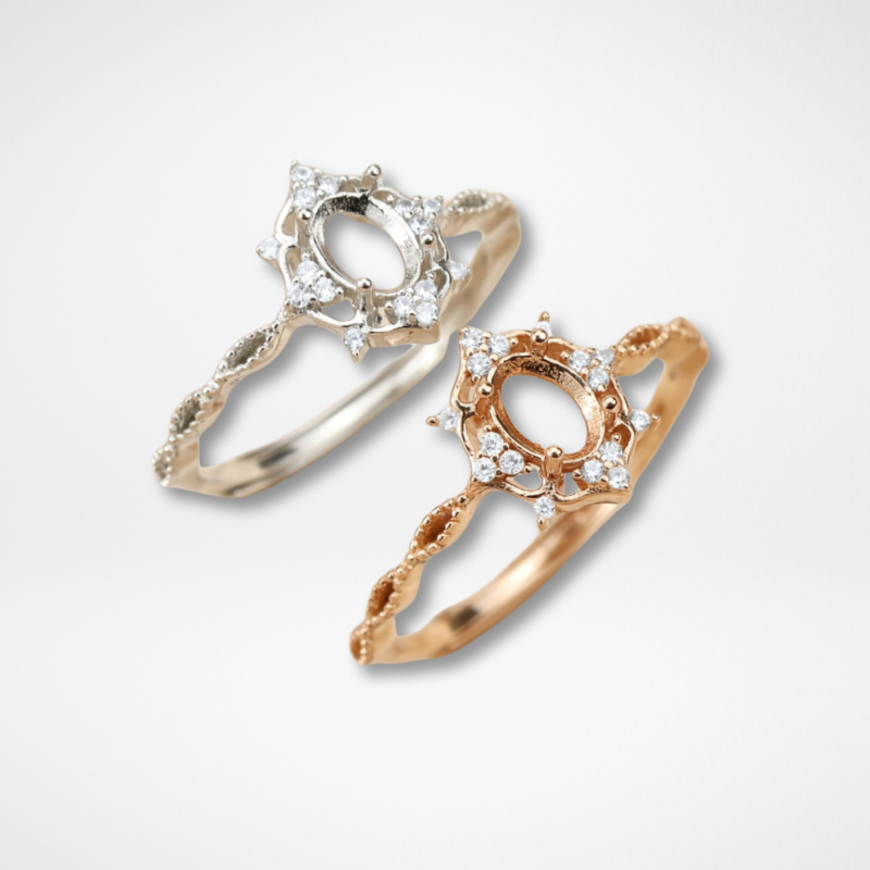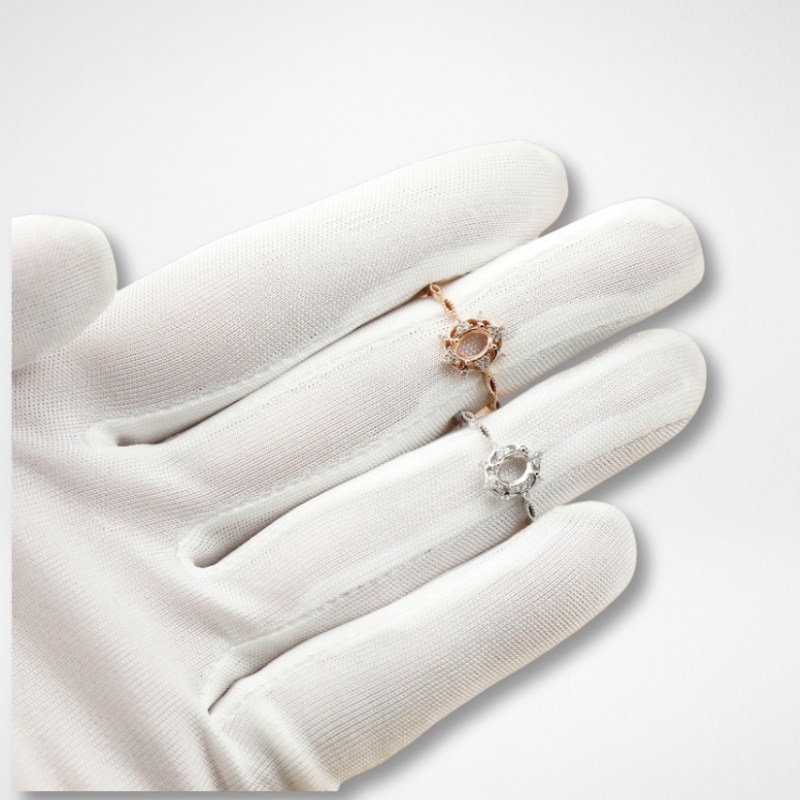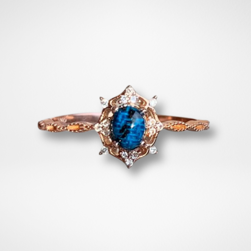 O Anel Êxtase possui um design clássico e sofisticado com uma pedra oval rodeada por detalhes ornamentados e zircônias no estilo Art Deco.