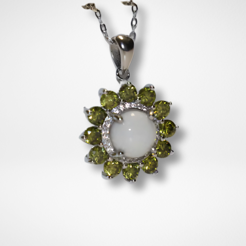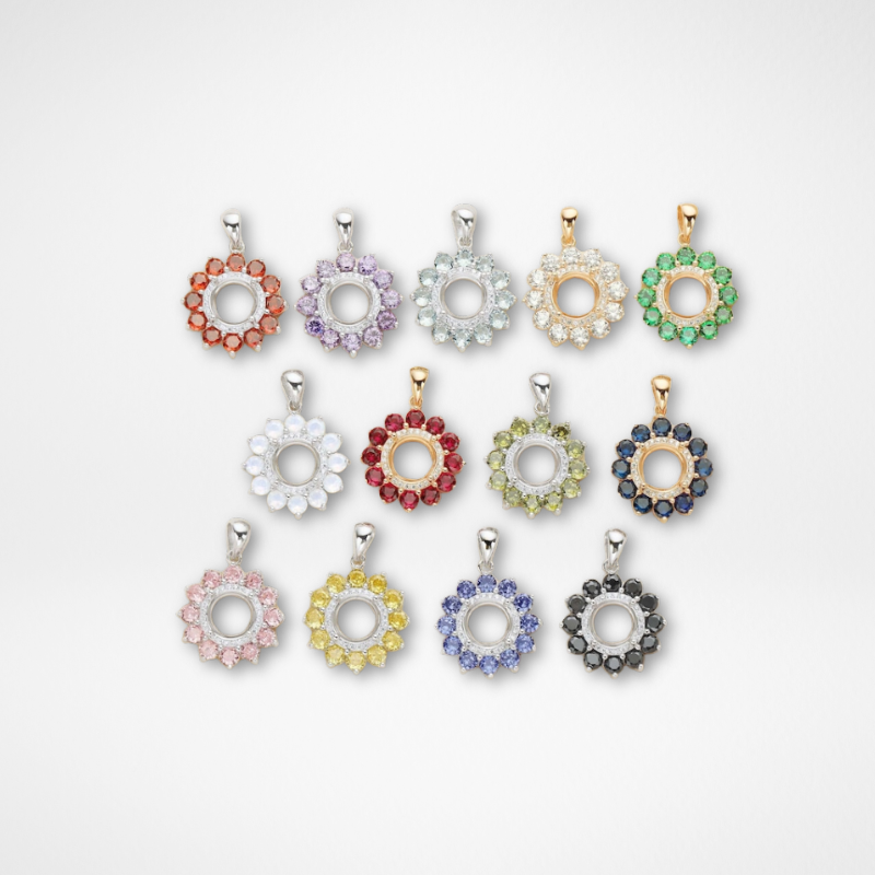 O Pendente Encanto possui um design moderno e minimalista, com um toque de elegância clássica. Ele é composto por uma pedra central redonda, rodeada por zircônias coloridas que representam as pedras do nascimento e dão destaque a joia.